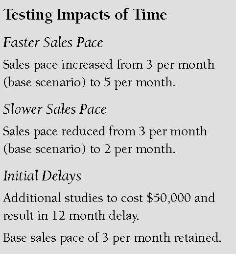 If we adjust the average pace of sales to only two units per month, significant cost increases are incurred. Management and Overhead costs keep running for a longer time, the project carries longer, and interest costs mount up. This alternative scenario results in a reduction of net cash return by more than $295,000 below the baseline analysis.